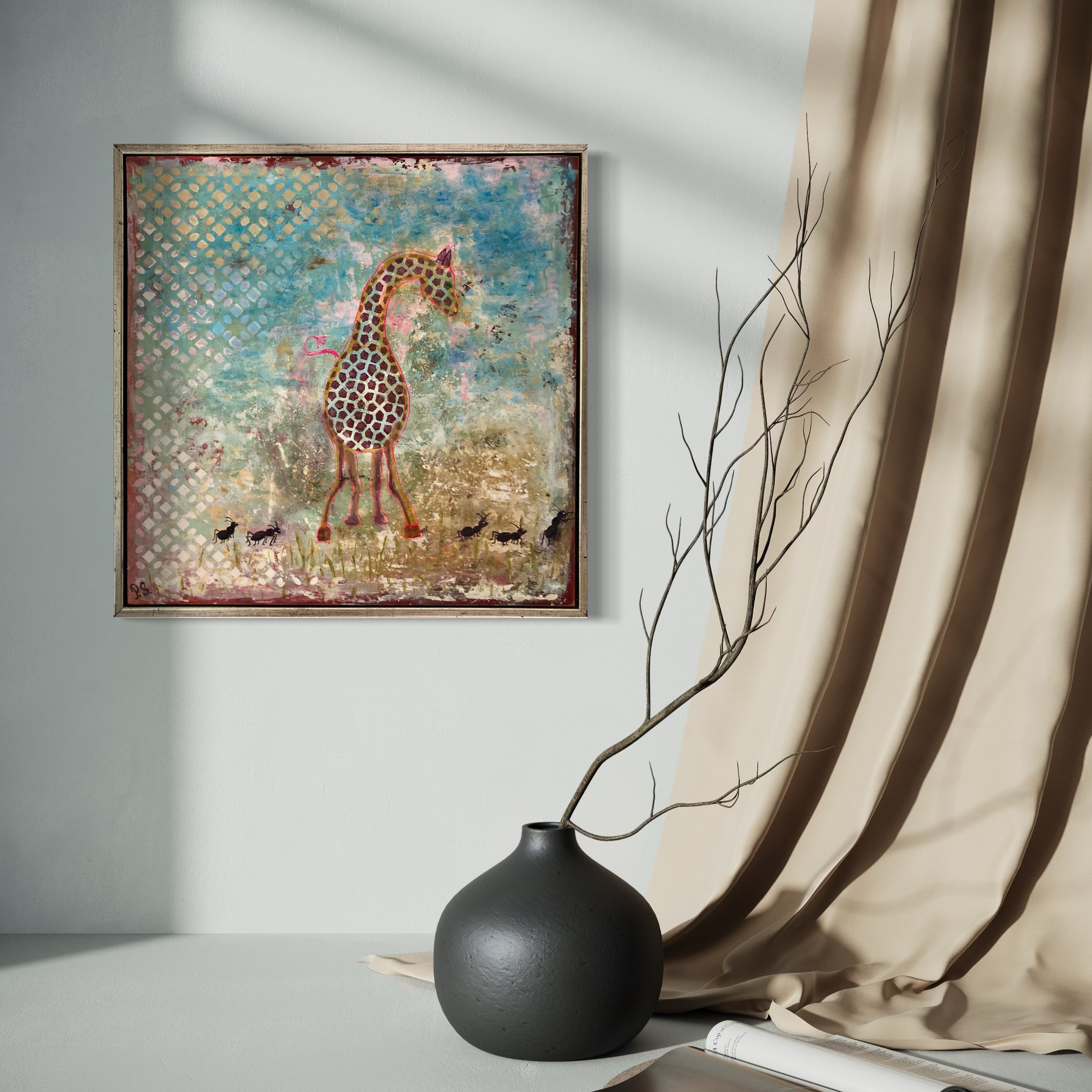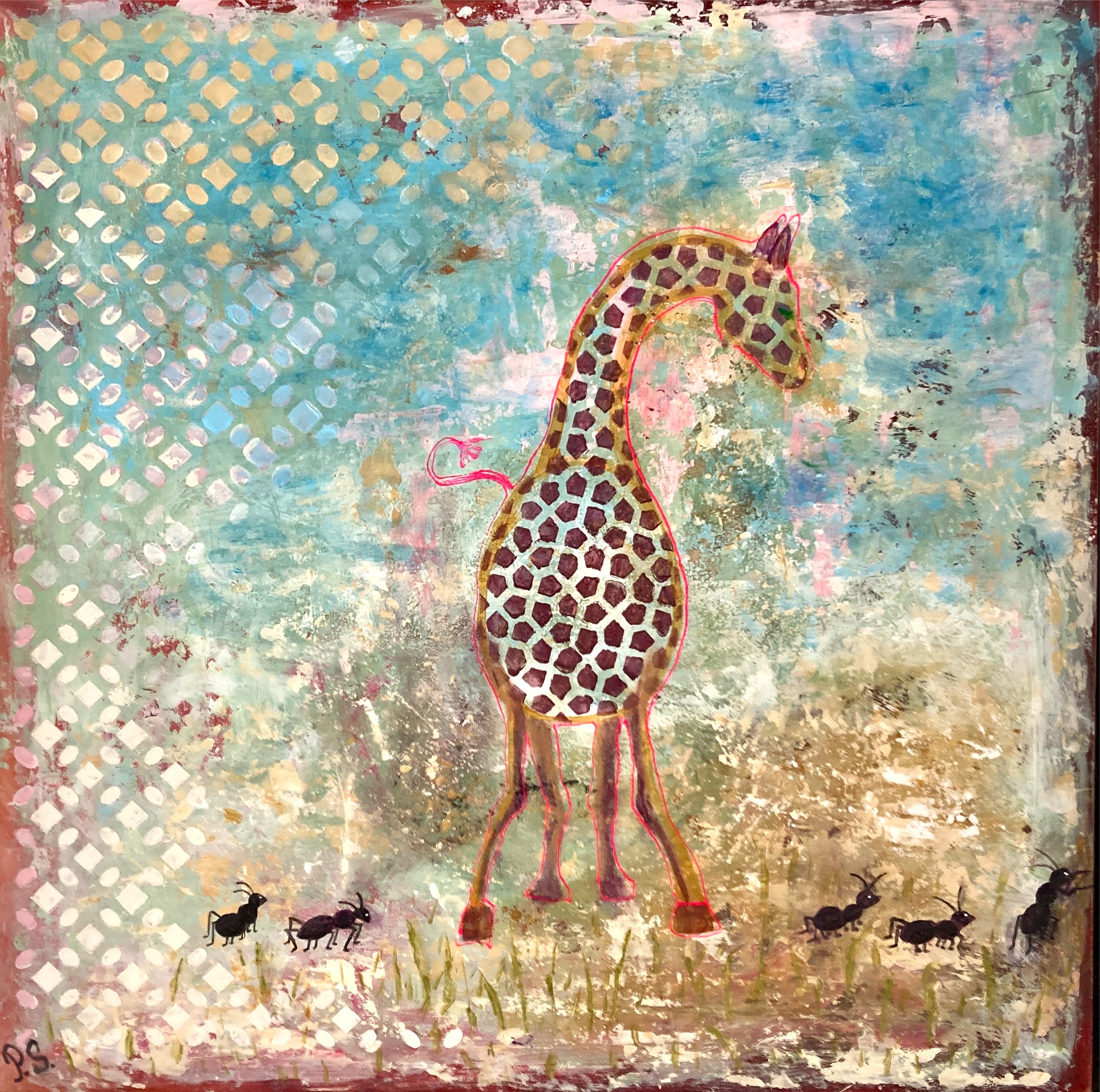 The artist had a lot of fun combining a mini-sized giraf with mega sized ants.